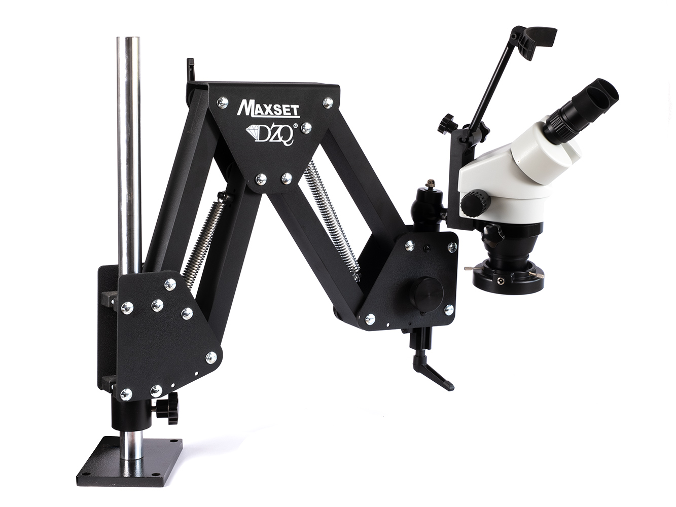 80 cm od podstawy, w dowolnym miejscu na powierzchni roboczej. Stolik jest mocno przymocowany do stołu warsztatowego lub linii montażowej za pomocą małej podstawy z czterema dołączonymi śrubami, które zapewniają doskonałą stabilność ramienia. Odległość obiektywu od podstawy mikroskopu (oś środkowa) jest regulowana w zakresie 36-80 cm. Ramię można obracać o 360° wokół własnej osi. Ze względu na długość ramienia, mikroskop może być wykorzystywany w produkcji przemysłowej, zwłaszcza