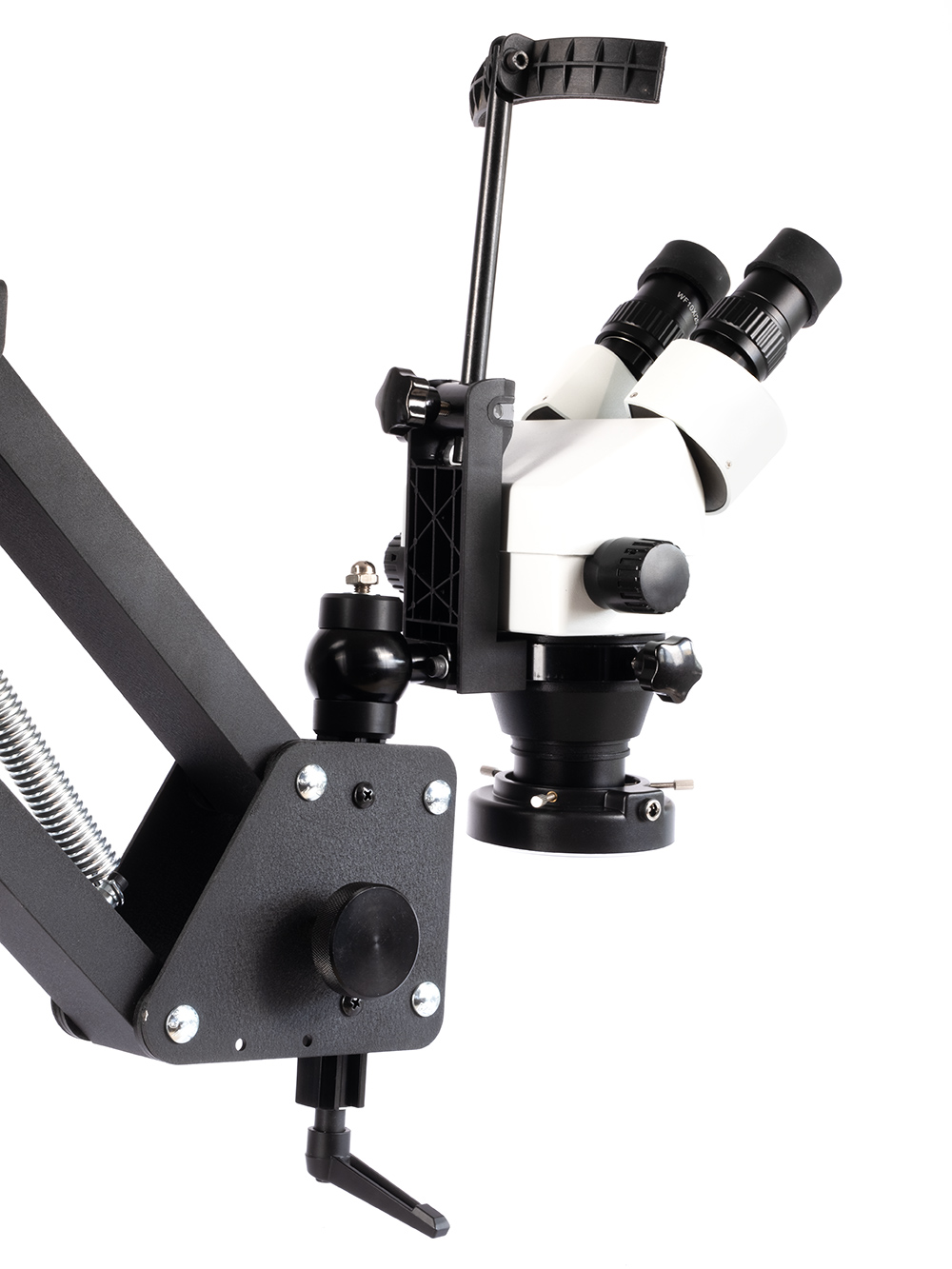 na linii montażowej - przesuwna taśma może swobodnie przechodzić pod mikroskopem, podczas gdy operator sprawdza jakość produktów. Po dokręceniu ramienia jest ono bardzo stabilne. Głowica mikroskopu jest przymocowana do ramienia za pomocą przegubu kulowego, który umożliwia jej swobodne obracanie. Elastyczne ramię zawiera również zagłówek, który umożliwia lepszą obserwację badanego obiektu - szybsze ustawianie ostrości, a także pełni funkcję ochronną, ponieważ częściowo zapobiega możliwym urazom oczu spowodowanym uderzeniem okularami.