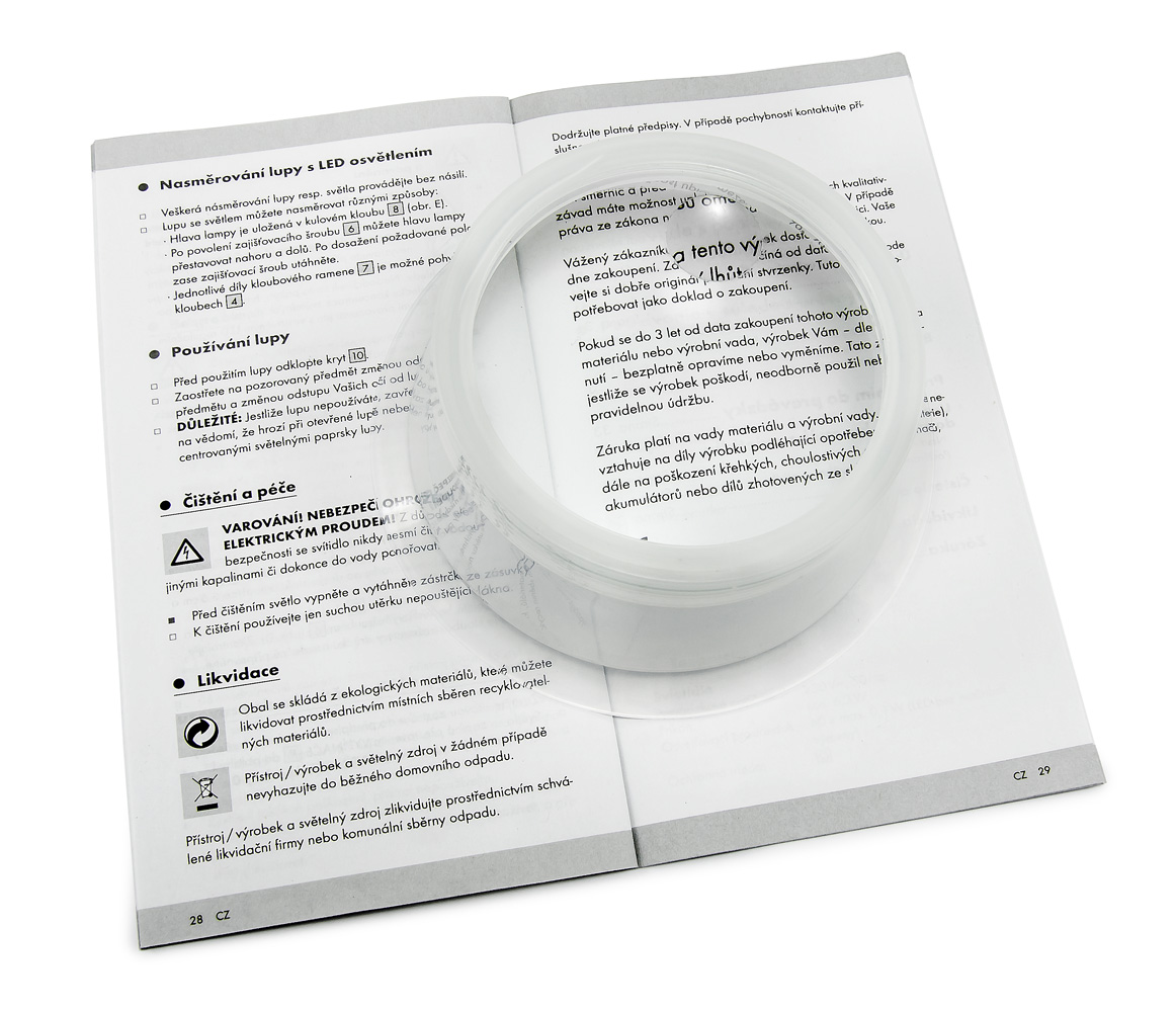 Duża ręczna lupa z podwójnym powiększeniem 1,8x i 5x oraz podświetleniem LED dla lepszego widzenia. Optyka lupy składa się z dwóch soczewek o różnych ogniskowych - głównej soczewki o 4 dioptriach i powiększeniu 1,8x o dużej średnicy 130 mm oraz dodatkowej lupy o 14 dioptriach, średnicy 25 mm i powiększeniu 5x, która znajduje się wewnątrz głównej soczewki w pobliżu rączki - patrz zdjęcie. Lupy wykonane są z twardego szkła akrylowego (PMMA). Oświetlenie obserwowanego tekstu lub obiektów zapewnia 12 białych diod LED umieszczonych równomiernie na obwodzie soczewki, które są zasilane dwiema bateriami ołówkowymi (AA) umieszczonymi w uchwycie. Baterie równoważą lupę, dzięki czemu wygodnie się ją trzyma. Lupa znajdzie szczególne zastosowanie przy czytaniu małych tekstów lub klasycznych tekstów dla osób starszych. Rozmiar głównej soczewki o średnicy 130 mm zapewnia idealnie duży obszar do czytania bez konieczności ciągłego przesuwania lupy.