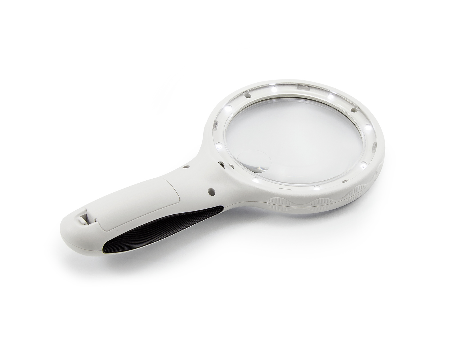 8 białych diod LED, które są zasilane trzema bateriami mikrostykowymi (AAA) umieszczonymi w uchwycie. Baterie doskonale wyważają lupę, dzięki czemu wygodnie się ją trzyma.