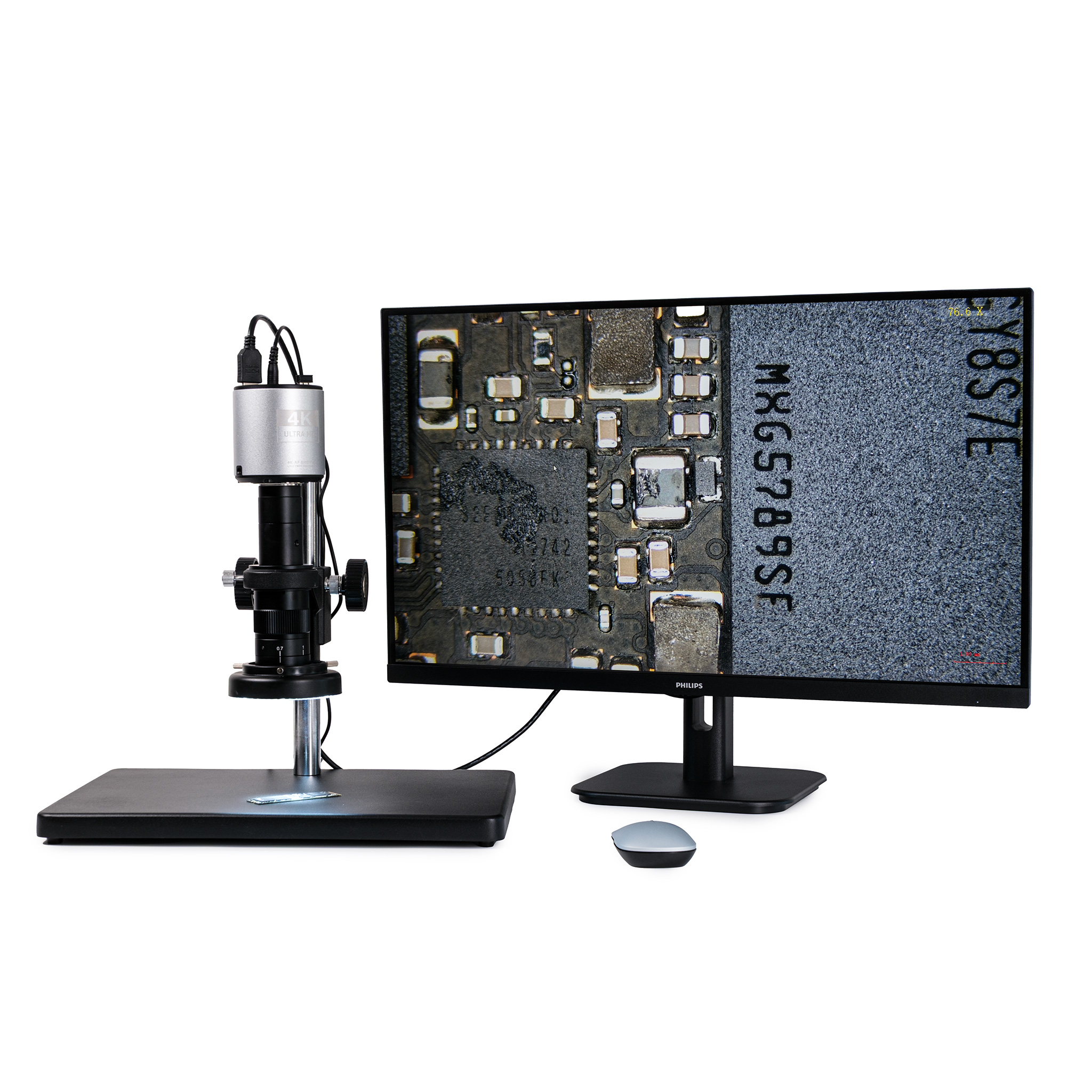 Podstawą zestawu jest kamera mikroskopowa 4K - 3840×2160px z wyjściem HDMI, która zapewnia obraz z prędkością do 60 klatek na sekundę w absolutnie płynnej i szczegółowej jakości. Kamera jest wyposażona w autofokus, który zapewnia szybkie i dokładne ustawianie ostrości bez konieczności ręcznego dostrajania, a w razie potrzeby może być również ustawiana ręcznie. Ogromną zaletą jest zintegrowane oprogramowanie pomiarowe, które działa niezależnie od komputera. Za pomocą bezprzewodowej myszy można dokonywać pomiarów długości, kątów, powierzchni lub obwodów bezpośrednio na wyświetlaczu, rysować kształty, wyświetlać skale i zapisywać wyniki w przejrzystych tabelach z wbudowanym podglądem obrazu lub jako zdjęcie 8 Mpix (JPG) lub wideo w rozdzielczości do 4K. Oczywiście możliwa jest również kalibracja w zależności od rodzaju zastosowanej optyki i wybranego powiększenia. Kalibracje są przechowywane bezpośrednio w pamięci kamery, więc pozostają nawet po jej wyłączeniu. Gwarantuje to, że wykreślone kształty dokładnie odpowiadają rzeczywistym wymiarom, a uzyskane pomiary są w pełni wiarygodne do zastosowań laboratoryjnych i przemysłowych.