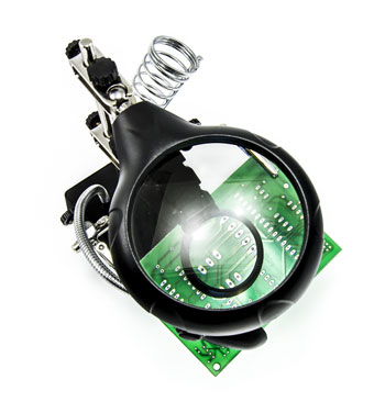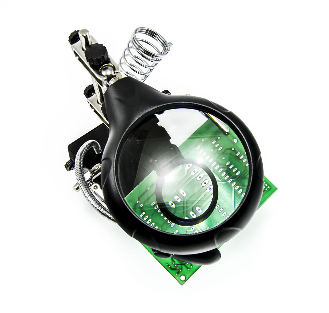 elastyczną lampą LED, uchwytem na płytkę drukowaną i stojakiem na mikrolutownicę w kompaktowej, małej, ale wysokiej jakości konstrukcji.