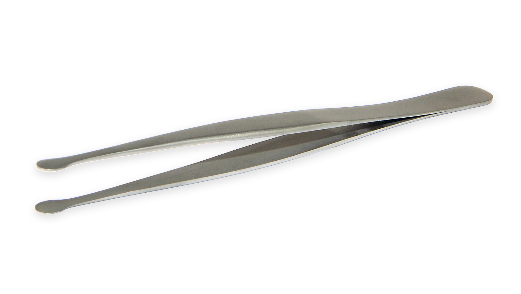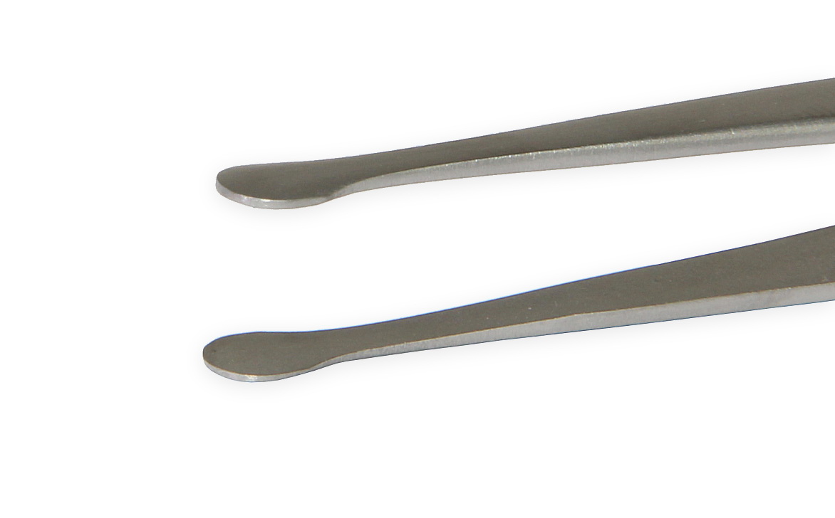 Płaska uniwersalna pęseta z okrągłymi płaskimi powierzchniami do chwytania przedmiotów. Wykonana ze stali nierdzewnej, antymagnetycznej. Odpowiednia do chwytania większych części.