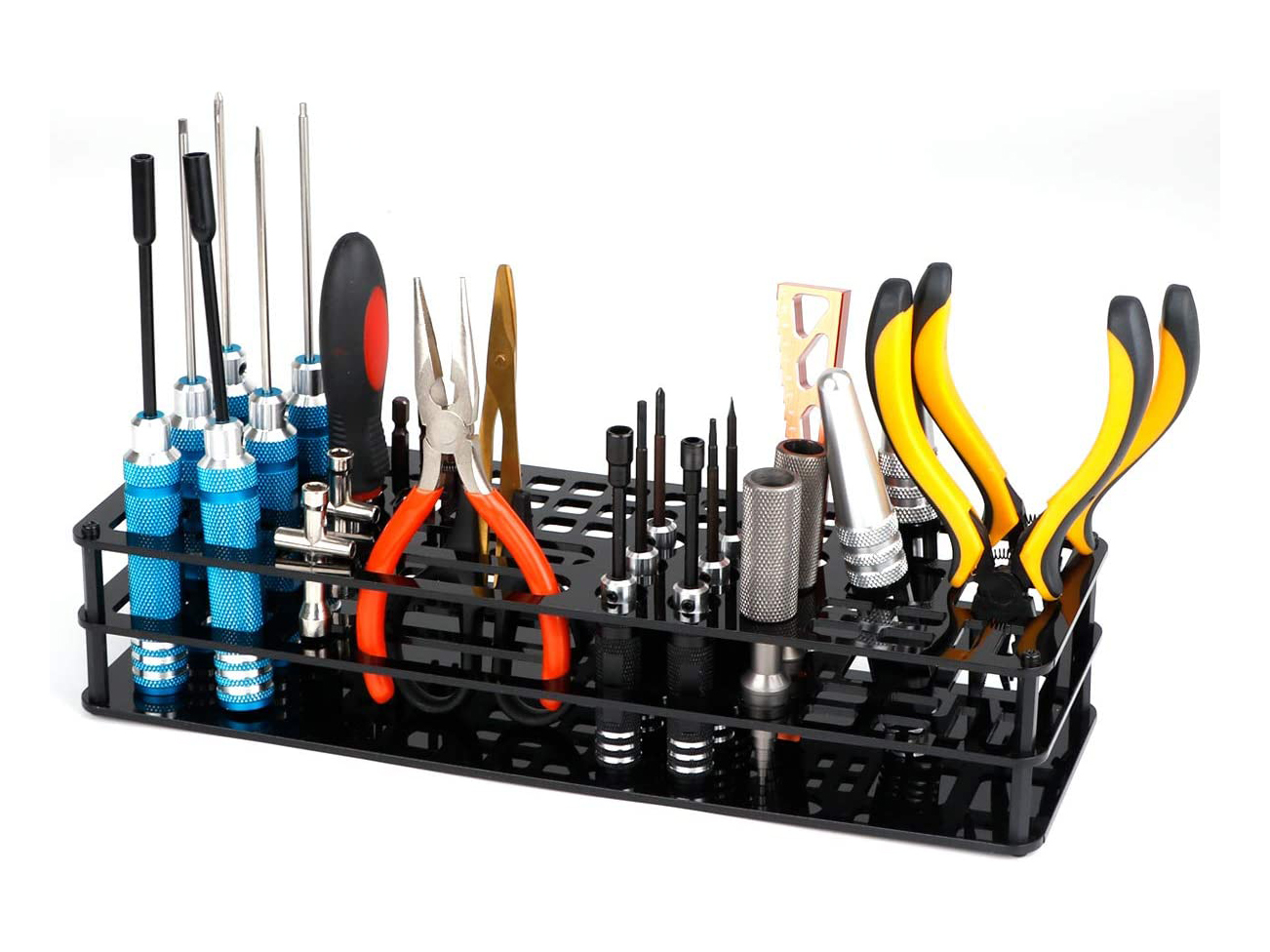 Organizer wykonany z czarnego błyszczącego poliwęglanu posiada łącznie 63 okrągłe i kwadratowe otwory w górnej części do wkładania różnych narzędzi, takich jak śrubokręty, pęsety, szczypce itp. Organizer jest szczególnie przydatny do przechowywania narzędzi na biurku, których często używasz i nieefektywne jest ciągłe chowanie ich w pudełkach i skrzynkach.