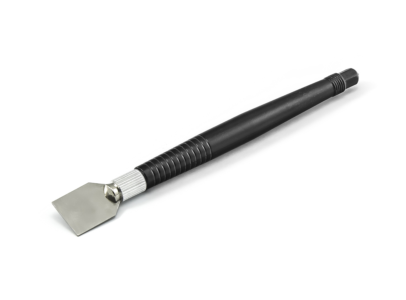 Szpachelka z metalową łopatką do nakładania pasty cynowej na otwory szablonu BGA. Skrobak typu 1 ma zdejmowany uchwyt; szerokość rakli wynosi 15 mm. Ze względu na większą szerokość, nadaje się do pracy z większymi szablonami lub jako narzędzie ochronne podczas lutowania gorącym powietrzem - służy jako bariera odwracająca strumień gorącego powietrza od elementów, które nie tolerują wysokich temperatur (plastik...).