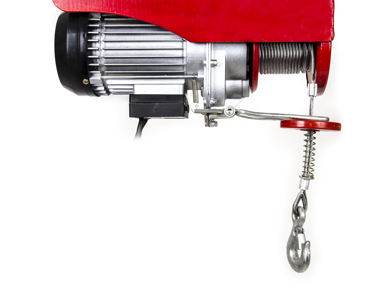 Kabel sterujący ma długość 270 cm (skrócony na zdjęciu). Wciągarka jest wyposażona w mechaniczny hamulec, który zatrzymuje nawijanie i blokuje wciągarkę w przypadku nawinięcia czerwonej przekładki. Następnie możliwe jest tylko odwijanie. Wyciągarka posiada samoblokujący się system przekładni, dzięki czemu nie ma ryzyka poluzowania liny w przypadku awarii elektrycznej.