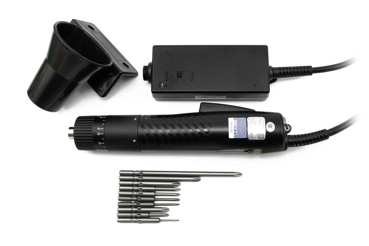 Zestaw zawiera elektryczny wkrętak dynamometryczny, zasilacz, magnetyzer/demagnetyzer do śrub i bitów, 8-częściowy zestaw bitów krzyżakowych, ścienny uchwyt do przechowywania wkrętaka.
