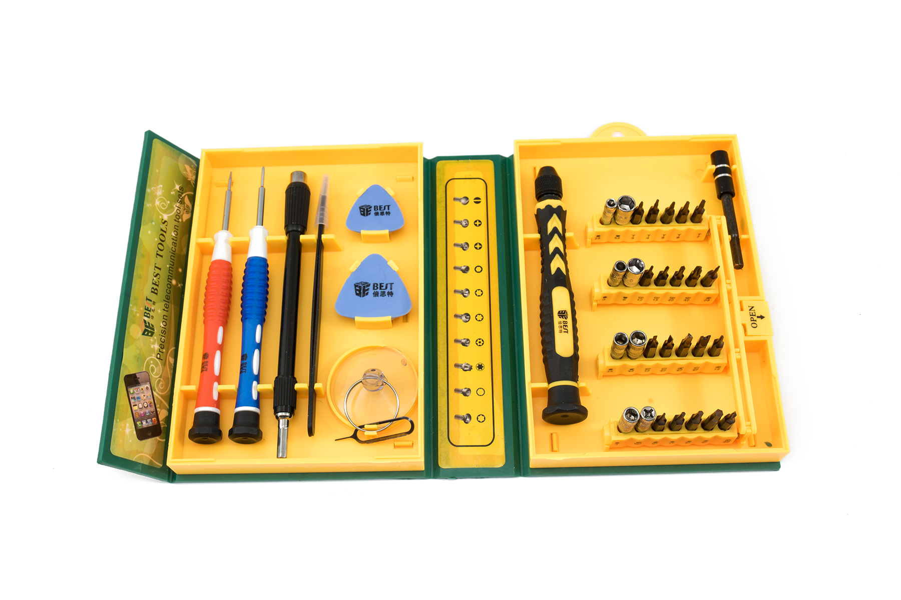Trzydziestoośmioczęściowy zestaw śrubokrętów, łomów i innych narzędzi do demontażu i ponownego montażu wszystkich produktów Apple, w szczególności iPhone'a, iPoda, iPada i Macbooka. Dzięki temu produktowi Besttools oferuje rozszerzoną alternatywę dla LMP iToolkit.