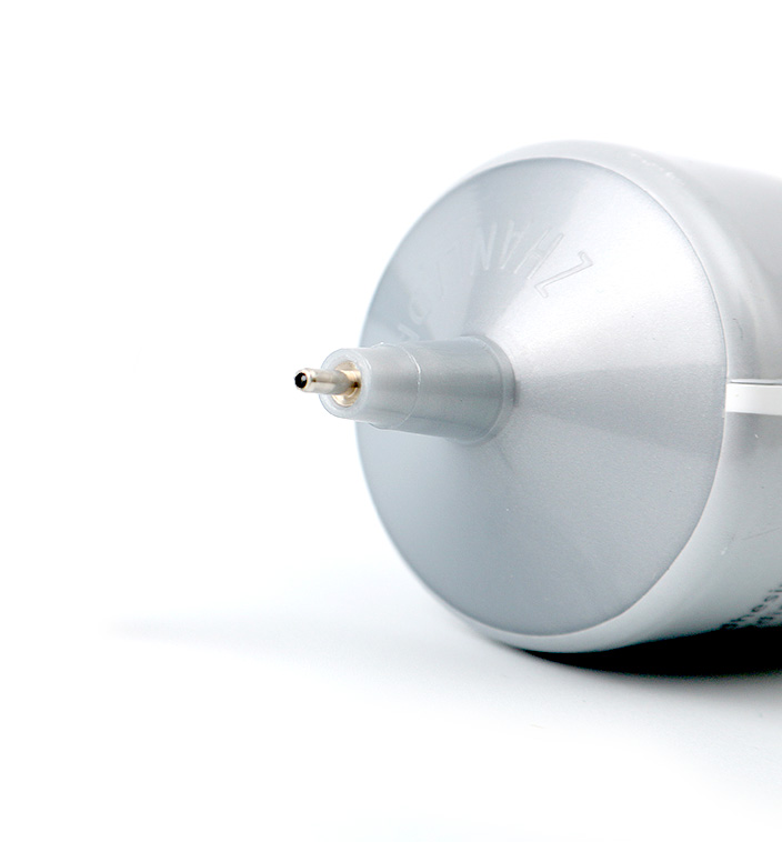 Opakowanie zawiera bardzo poręczną metalową końcówkę do łatwej i dokładnej aplikacji, która po zamknięciu jest zatkana igłą w nakrętce.