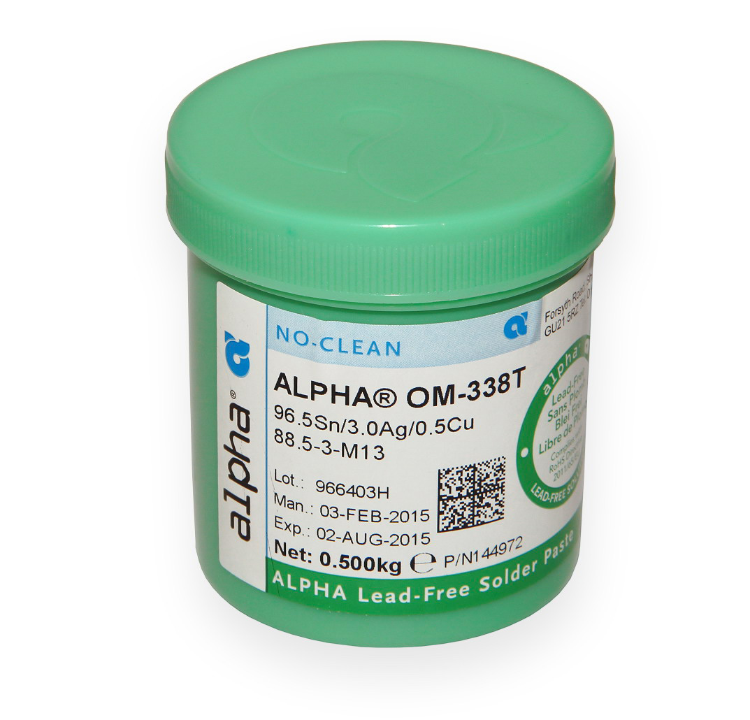 OM-338T to bezołowiowa, bezhalogenowa i bezpłucząca pasta odpowiednia do wymiany praktycznie wszystkich stopów ołowiu. Charakteryzuje się szerokim zakresem temperatur reflow i doskonałą odpornością na pęcherzyki powietrza. Zapewnia doskonałą wydajność podczas drukowania na szablonach o drobnym skoku z prędkością drukowania do 200 mm/s (8 cali/s). Ponadto konsystencja pasty jest niezwykle delikatna dla szablonu i pozwala na wykonanie do 11 milionów powtórzeń. Pasta jest kompatybilna zarówno z procesami rozpływowymi w atmosferze powietrza, jak i azotu.
