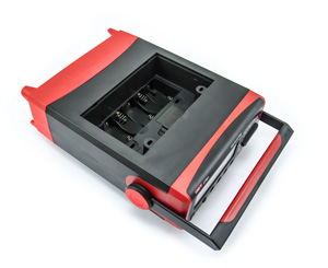 We wnętrzu multimetru stacjonarnego znajduje się pudełko, w którym można przechowywać sondy. Pod tym schowkiem znajduje się również pojemnik na baterie, który może pomieścić 6 baterii jednoogniwowych typu C (R14 C), które zapewniają długą żywotność i przenośność. Przenośność jest również ułatwiona dzięki regulowanemu uchwytowi, który służy przede wszystkim jako stojak, który może być używany do regulacji miernika w celu uzyskania idealnego kąta widzenia. W obudowie znajduje się również łatwo dostępna skrzynka bezpieczników. Zasilanie może odbywać się za pomocą baterii lub dołączonego zasilacza sieciowego. Z tyłu miernika znajduje się przełącznik zasilania.