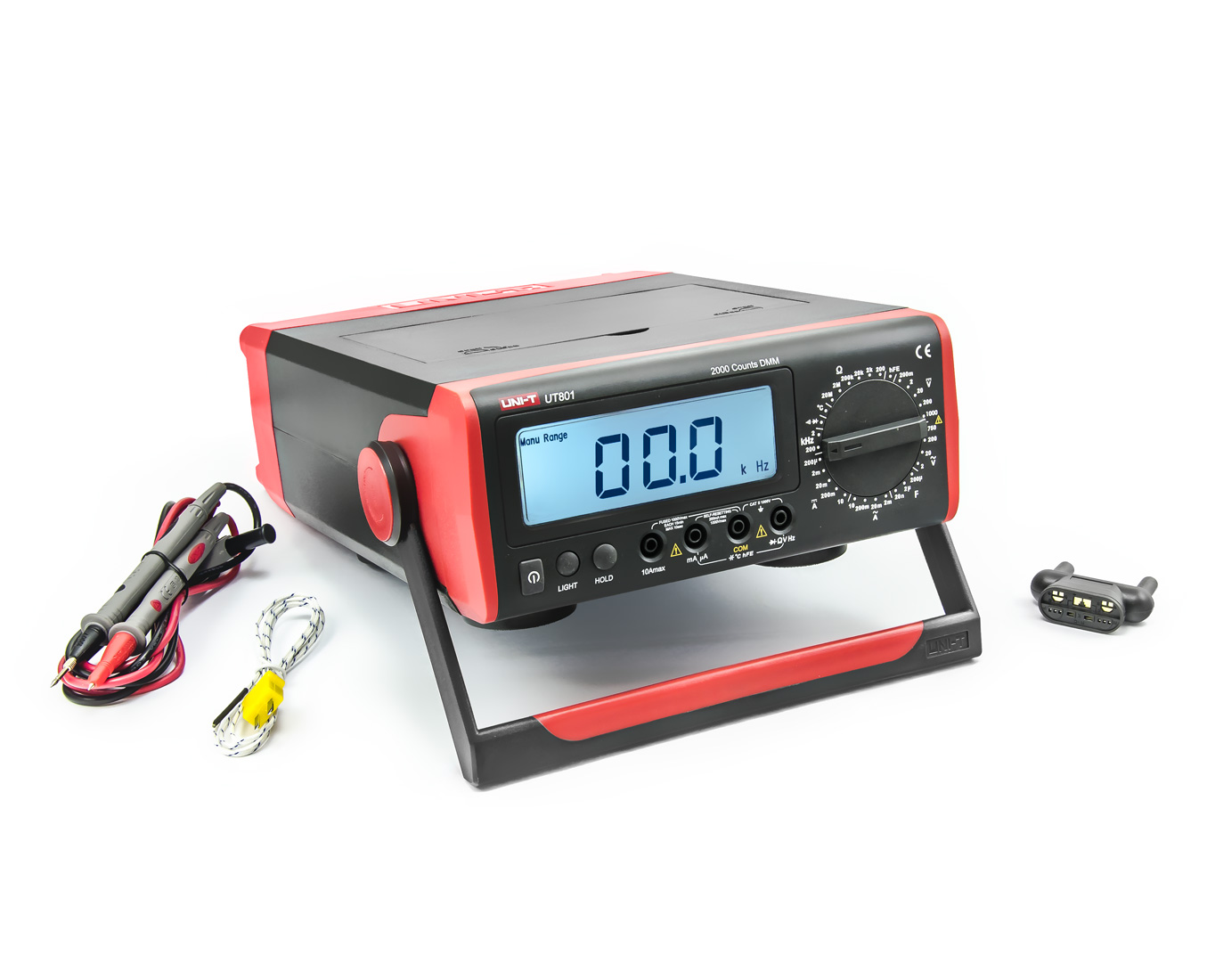UNI-T UT801 to dobrze wykonany, nowoczesny multimetr laboratoryjny z dużym 3 1/2-cyfrowym wyświetlaczem o wymiarach 108 x 38 mm, ikonami graficznymi i niebiesko-białym podświetleniem. Posiada funkcję wstrzymania wyświetlania danych lub tryb uśpienia w celu oszczędzania energii/baterii. UT801 oferuje pomiar wszystkich typowych wielkości i szereg doskonałych funkcji. Multimetr UNI-T UT801 umożliwia pomiar napięcia do 750V AC i 1000V DC, prądu do 10A AC/DC, rezystancji do 20MOhm, temperatury (do 1000°C), częstotliwości do 200kHz, pojemności do 200uF, przewodności (brzęczyk) i przepustowości diody. Multimetr biurkowy UT801 zawiera również specjalny adapter z powierzchniami stykowymi, które ułatwiają pomiar tranzystorów, kondensatorów, a także łączą się z dołączoną sondą termopary.