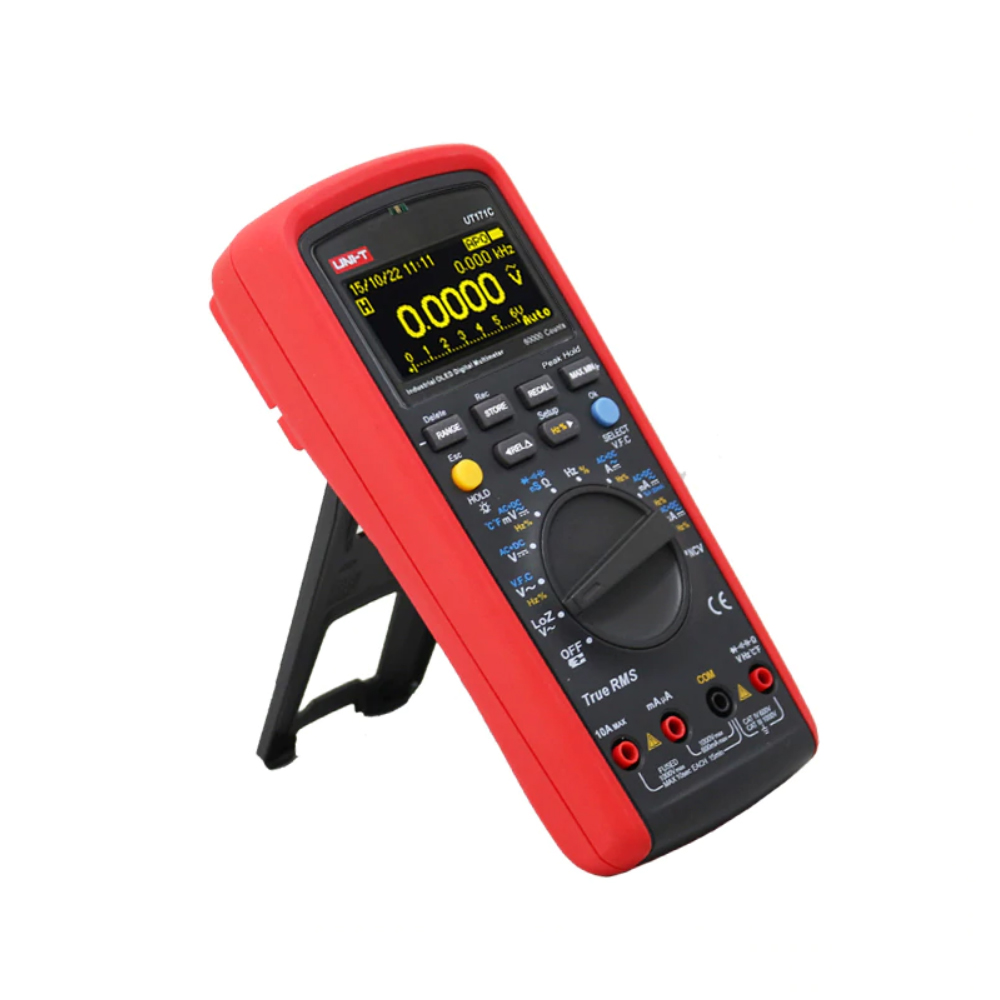 Profesjonalny multimetr UNI-T z wyświetlaczem LCD służy do pomiaru wszystkich typowych wielkości (napięcie, prąd, rezystancja). Niektóre modele są wyposażone w szereg funkcji, takich jak pojemność, częstotliwość, temperatura, T-RMS, latarka, pomiar tranzystorów itp. w zależności od typu modelu (patrz lista funkcji poniżej). Multimetry są najczęściej używanymi przyrządami pomiarowymi w pomiarach i naprawach urządzeń elektrycznych, sprzętu biurowego, dystrybucji energii w budynkach, okablowania samochodowego lub w produkcji i hobbystycznym tworzeniu różnych projektów i produktów elektrycznych. Multimetry są wyposażone w gniazda, które są podłączone do przewodów pomiarowych z końcówkami, za pomocą których następnie przeprowadzany jest pomiar, wszystkie zmierzone wartości są wyświetlane na wyświetlaczu LCD na korpusie przyrządu. Pokrętło na środku multimetru służy do ustawiania funkcji lub zmiany zakresu pomiarowego. Przyrząd może być trzymany w dłoni, umieszczony na stole lub postawiony za pomocą zawiasowej stopki na korpusie przyrządu. Multimetry są gumowane w celu zwiększenia trwałości i żywotności przyrządu.