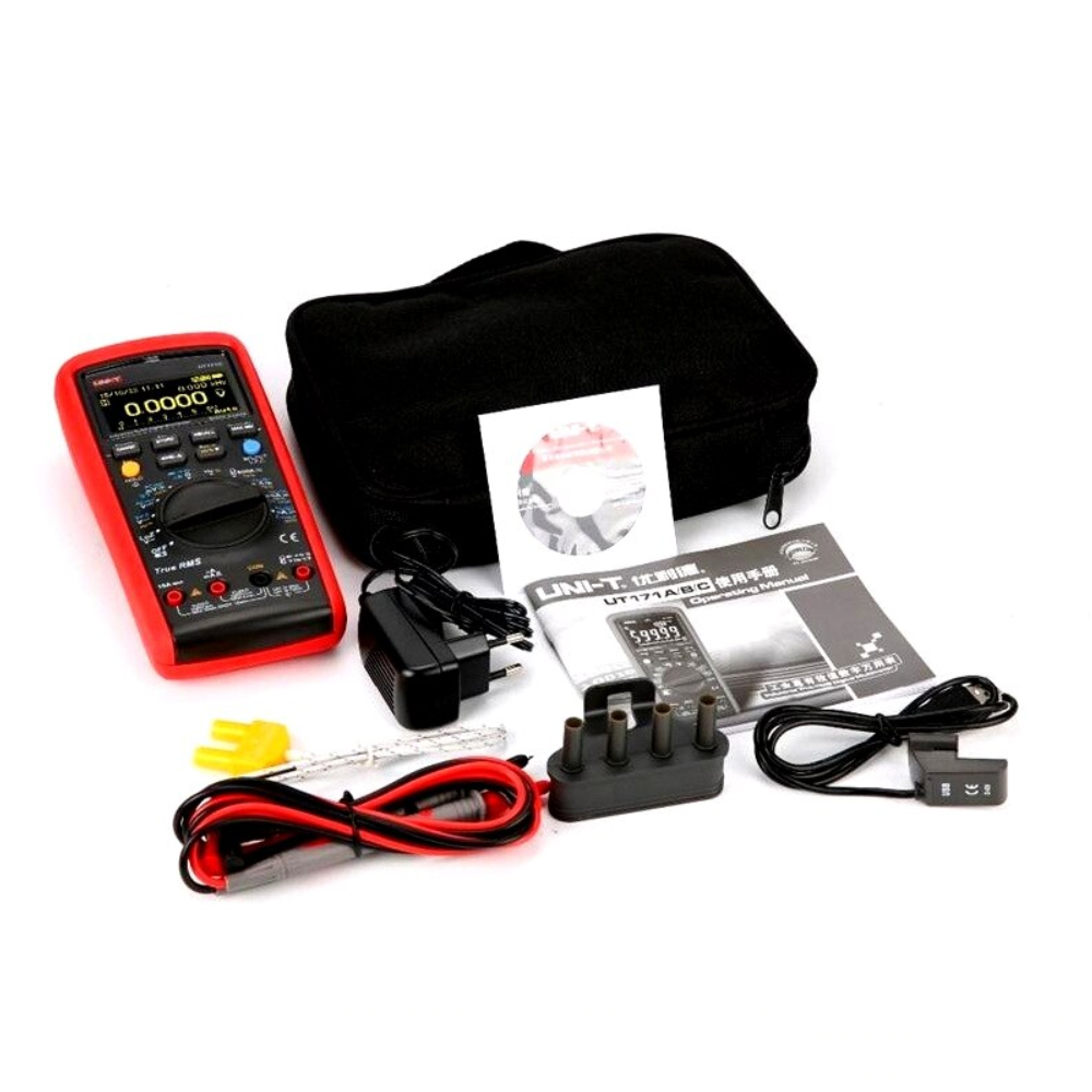 Zawartość zestawu: UT171C, przewody pomiarowe, etui, kabel USB