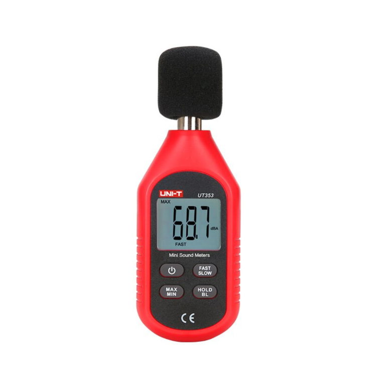 UNI-T UT353 to kompaktowy miernik hałasu do pomiaru i kontroli poziomu hałasu w budynkach, na zewnątrz wokół domów w pobliżu autostrad, linii kolejowych, barów lub pomiaru głośności sprzętu i urządzeń w przemyśle i produkcji. Poziomy hałasu są mierzone głównie pod kątem możliwych przekroczeń limitów określonych w przepisach zdrowotnych. Nadmierne zanieczyszczenie hałasem może niekorzystnie wpływać zarówno na ludzi, jak i na zwierzęta, a przy długotrwałym narażeniu na hałas może również dojść do uszkodzenia słuchu. Miernik hałasu UT353 jest wyposażony w czuły mikrofon pojemnościowy o zakresie od 31,5 Hz do 8000 Hz, który jest w stanie mierzyć poziomy ciśnienia akustycznego w zakresie od 30 do 130 dB. Wszystkie zmierzone wartości są wyświetlane na podświetlanym wyświetlaczu 32x26mm, a miernik hałasu jest zasilany 3 bateriami AAA.