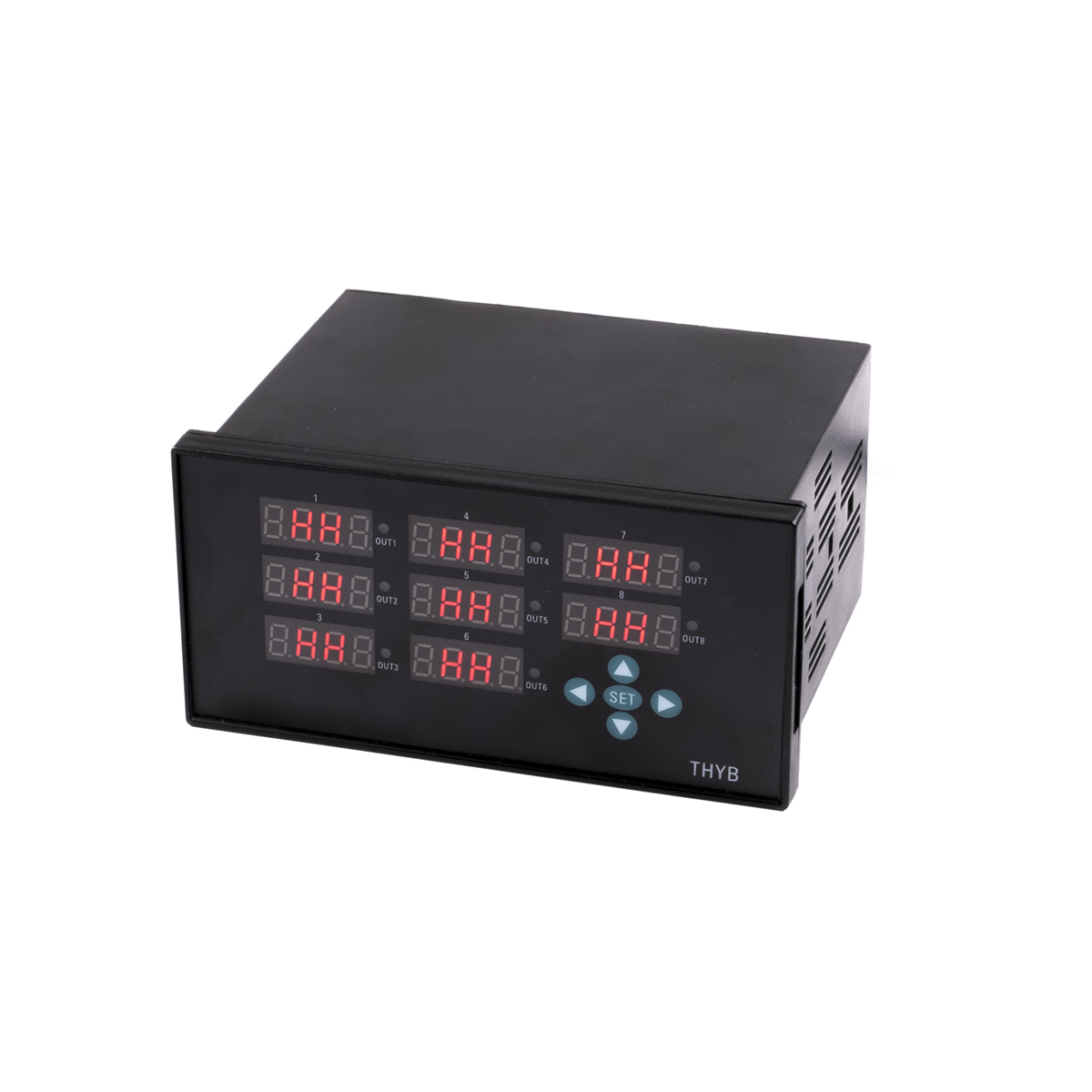 Ośmiokanałowy sterownik z czerwonymi wyświetlaczami LED jest przeznaczony do wbudowania w panel urządzenia. Regulator PID jest wyposażony w osiem wejść czujników temperatury (K, E, S, J) i osiem wyjść przekaźnikowych 230V/3A AC do sterowania urządzeniem. Wszystkie niezbędne parametry można ustawić w menu sterownika.