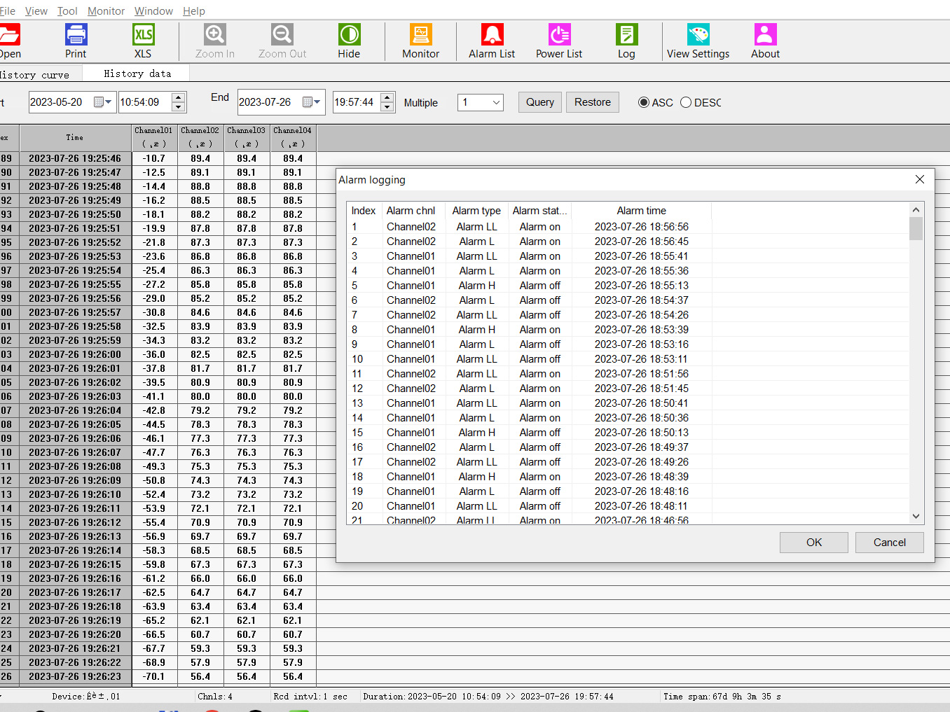 Ustawienia alarmów dla każdego kanału osobno: LO, HI, LL, HH