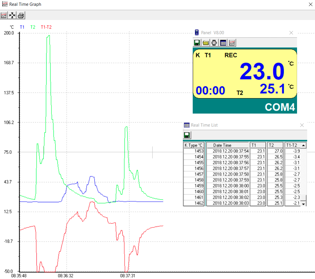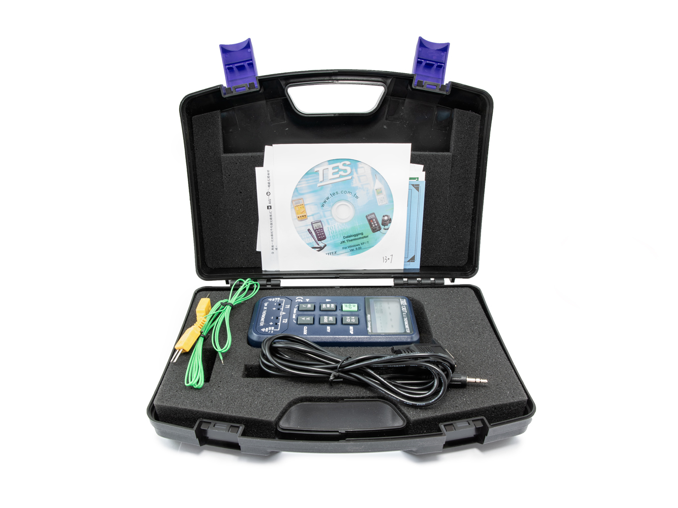 Wysokiej jakości dwukanałowy termometr TES-1307 od -190°C do 1333°C jest przeznaczony do bezpośrednich pomiarów i rejestracji temperatury w pamięci wewnętrznej lub w komputerze PC za pośrednictwem łącza szeregowego RS232. Termometr oferuje duży, czytelny wyświetlacz pokazujący wszystkie temperatury bez potrzeby przełączania. Można do niego podłączyć od 1 do 2 sond termoparowych typu K, które znajdują się w zestawie.