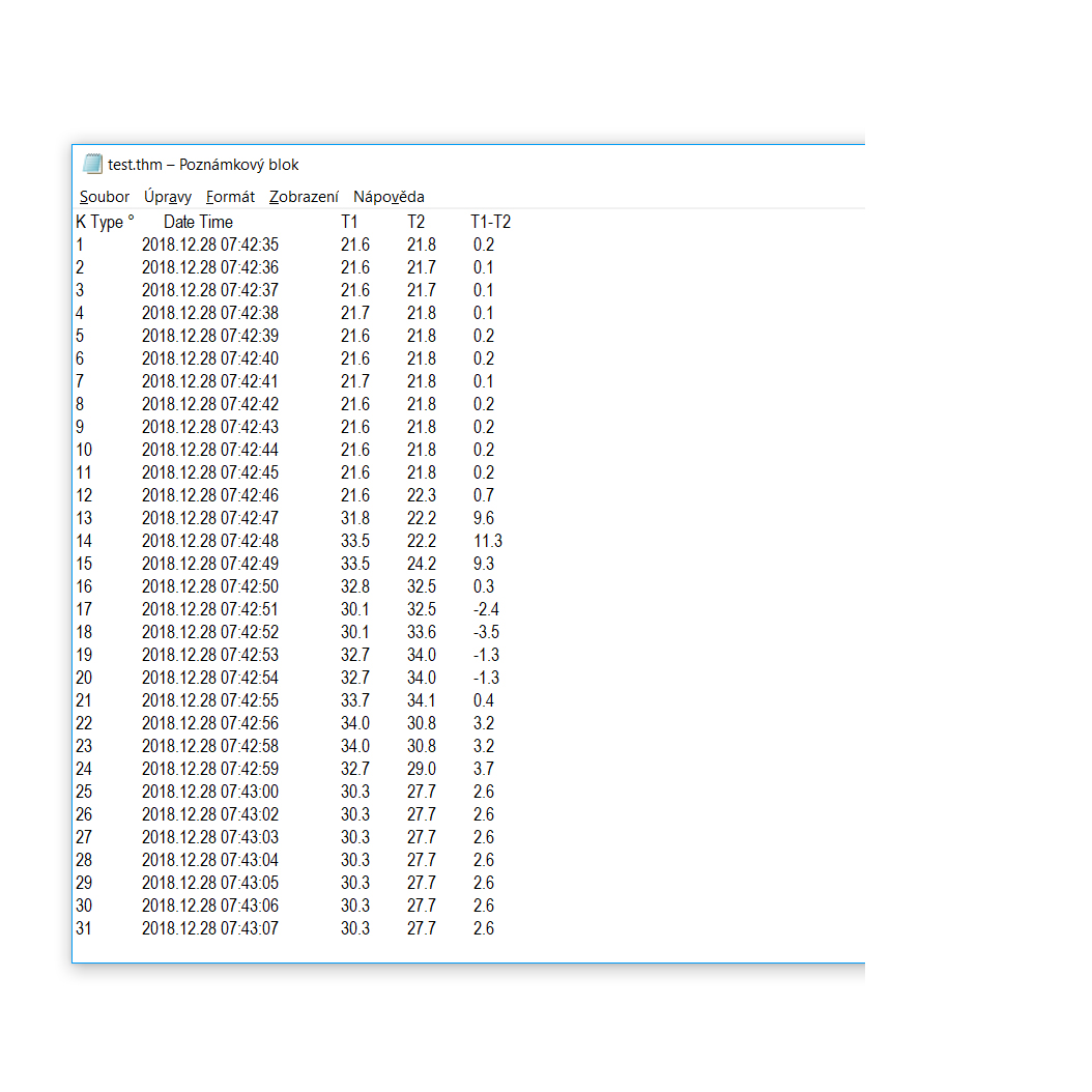 Datalogger TempU03 do długo- i krótkoterminowego pomiaru i rejestracji temperatury i wilgotności w zakresie -30℃~60℃ (temperatura), 0%~100% (wilgotność). TempU03 to bardzo kompaktowe urządzenie pomiarowe do rejestrowania i gromadzenia danych o temperaturze i wilgotności otoczenia. Rejestrator danych jest wyposażony w mały wyświetlacz LCD do natychmiastowego wyświetlania temperatury/wilgotności i stanu urządzenia. Wbudowana pamięć pozwala na przechowywanie do 32 000 rekordów pomiarowych z interwałem od 10s do 18h. Oprogramowanie dostarczane wraz z rejestratorem służy do ustawiania interwału, zarządzania bazą danych, ustawiania offsetu temperatury i wilgotności, alarmu lub automatycznego uruchamiania. Zaletą tego modelu jest automatyczne tworzenie plików PDF i CVS bez konieczności uruchamiania dodatkowego oprogramowania, po podłączeniu rejestratora do komputera wygenerowane pliki są automatycznie wyświetlane. Urządzenie łączy się z komputerem za pomocą złącza USB-A, które jest ukryte pod plastikową osłoną, rejestrator jest zasilany baterią litową CR2032. Rejestratory danych są urządzeniami pomiarowymi przeznaczonymi do krótko- i długoterminowych pomiarów temperatury, wilgotności. Pomiary są wykonywane w ustawionych przez użytkownika odstępach czasu, zwykle urządzenia te mogą przechowywać do kilkudziesięciu tysięcy rekordów w jednym pomiarze. Po zakończeniu pomiaru wszystkie zmierzone dane są przesyłane do komputera PC za pośrednictwem portu USB. Dołączone oprogramowanie generuje przejrzyste wykresy i tabele na podstawie zmierzonych danych, dając użytkownikowi pełny przegląd zmian temperatury i wilgotności w zadanym okresie czasu. Rejestratory danych są idealnym narzędziem do pomiaru i kontroli w miejscach, w których wymagany jest stabilny klimat, takich jak lodówki, piwnice, magazyny, duże gospodarstwa rolne, szklarnie, chłodnie, pojazdy transportu publicznego, kontenery, archiwa itp. Rejestratory danych są w stanie generować ciągłe zapisy od kilku minut do kilku miesięcy. Dla tego produktu może zostać wydany akredytowany certyfikat dokładności pomiaru temperatury lub wilgotności. Każdy miernik, po wydaniu certyfikatu, przechodzi przez akredytowane laboratorium kalibracyjne, które wydaje świadectwo kalibracji. Pomiar i wydanie certyfikatu kalibracji kosztuje 1000 CZK bez VAT za każdą sztukę miernika, a cena ta obejmuje kalibrację w trzech punktach temperatury/wilgotności zgodnie ze specyfikacją klienta. Pomiary temperatury i wilgotności są naliczane oddzielnie! Łącznie za certyfikaty wilgotności i temperatury dla jednego urządzenia pobierana jest opłata w wysokości 2000 CZK bez VAT. Możliwe jest jednak wykonanie kalibracji tylko dla pomiarów temperatury lub wilgotności zgodnie ze specyfikacją klienta.