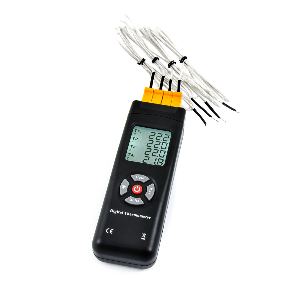 Czterokanałowy termometr termoparowy THE-27 pracujący w maksymalnym zakresie od -50°C do 1350°C z dowolną sondą termoparową typu K. Rozdzielczość pomiaru temperatury wynosi 0,1°C, dokładność pomiaru wynosi +/- 0,015%rdg+1°C. Termometr oferuje duży, czytelny wyświetlacz pokazujący wszystkie temperatury bez konieczności przełączania. Wyświetlacz jest również podświetlany na niebiesko-biało dla lepszej czytelności w ciemności (można go wyłączyć). Wymiary wyświetlacza to 35x38mm. Można podłączyć od 1 do 4 sond termoparowych typu K, które znajdują się w zestawie. dwie sondy termoparowe typu K (dostarczone sondy termoparowe oferują zakres pomiarowy od -50 do 300°C)