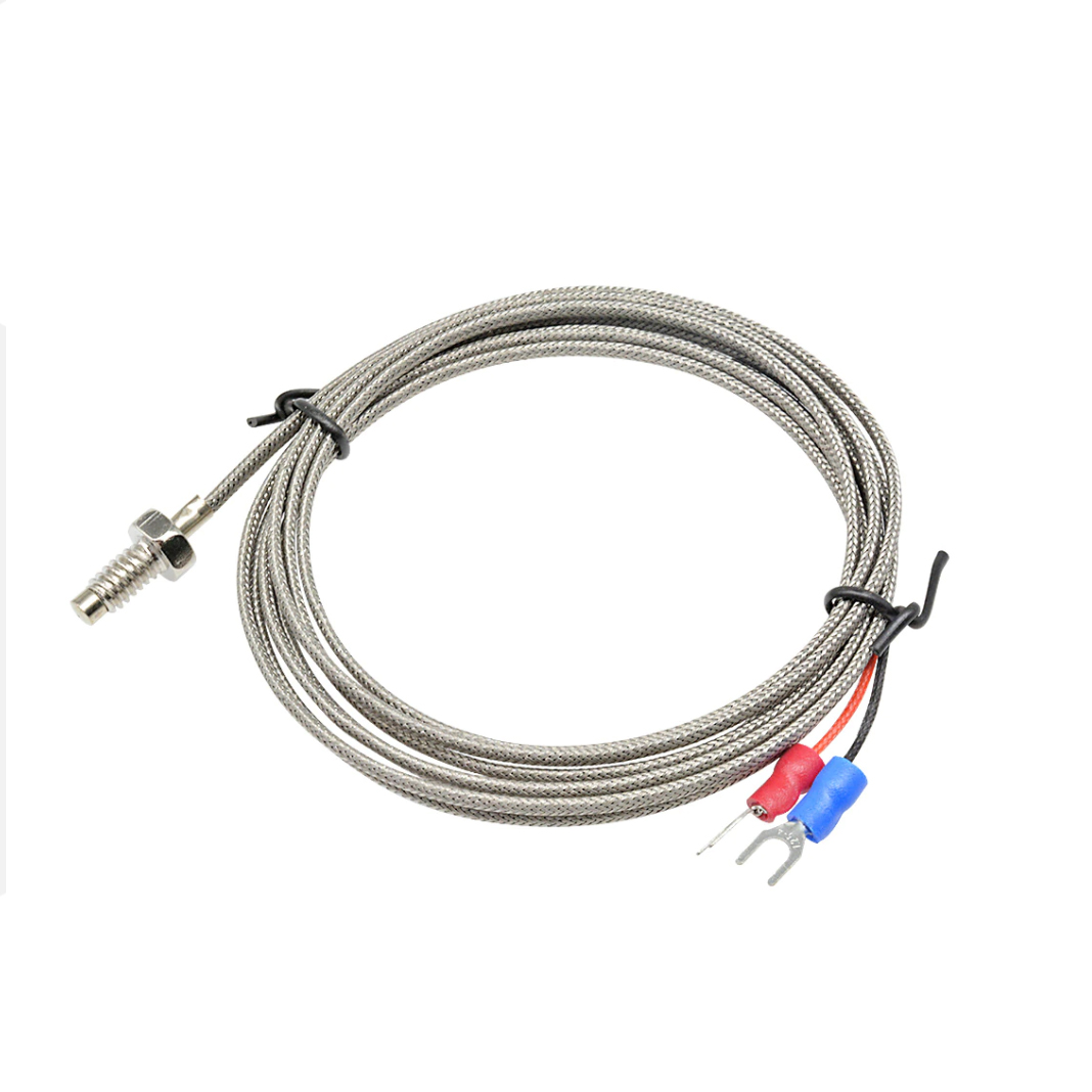 Sonda temperatury jest umieszczona w metalowej tulei ochronnej ze stali nierdzewnej, która chroni czujnik temperatury przed wysokimi temperaturami i uszkodzeniami mechanicznymi lub chemicznymi. Czujnik temperatury nadaje się do pomiaru temperatur w zakresie 0~400℃. Gniazdo o długości 5 mm z gwintem M6 ukrywa czujnik temperatury typu K, który jest podłączony do podwójnej linii o długości 3 m, która jest chroniona stalową skarpetą, przewody są zakończone widelcem do podłączenia do bloku zacisków.