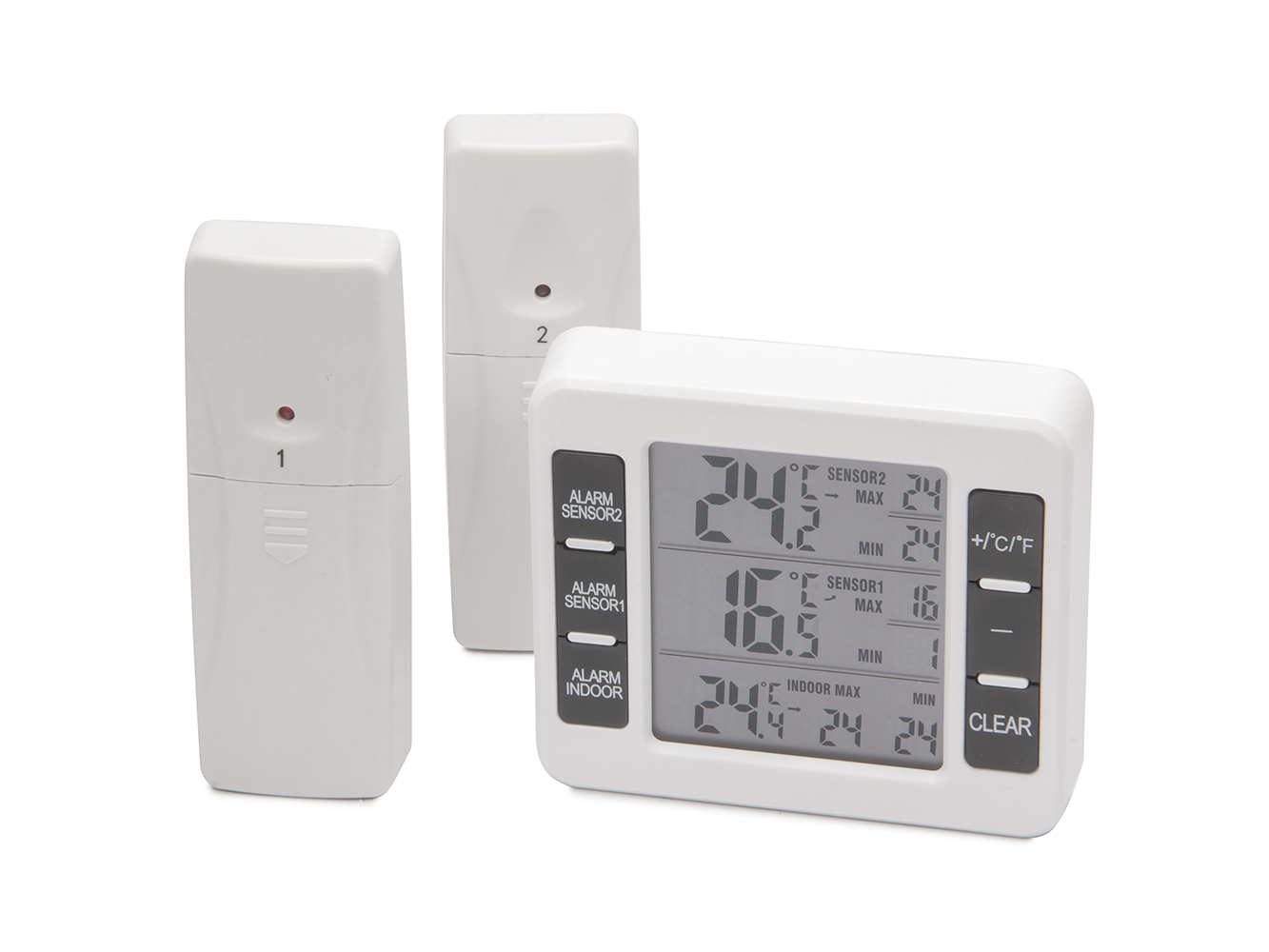 Cyfrowy termometr z jednym wewnętrznym i dwoma bezprzewodowymi czujnikami temperatury z funkcją alarmu dźwiękowego ostrzegającego o niskiej lub wysokiej temperaturze w punkcie pomiarowym. Termometr z funkcją alarmu jest szczególnie przydatny do pomiaru i monitorowania temperatury w kuchniach, restauracjach, zamrażarkach, lodówkach lub miejscach pracy, gdzie konieczne jest ciągłe monitorowanie i pomiar temperatury. Termometru można jednak również używać w domu do rutynowych pomiarów temperatury w pomieszczeniach, garażach, ogrodach zimowych lub na zewnątrz.
