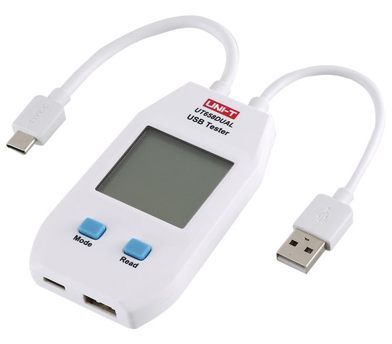 Zmierzone wartości są wyświetlane w czasie rzeczywistym na parze segmentowanych wyświetlaczy LED, niebieskim dla napięcia i czerwonym dla prądu. Rozdzielczość pomiaru wynosi 10 mA dla amperomierza i 10 mV dla woltomierza. Pomiary mogą być również wykonywane w trybie podwójnym - tj. pobór mocy dwóch urządzeń w tym samym czasie, ponieważ oprócz wejścia, ten tester USB zawiera również dwa wyjścia mierzone jednocześnie.
