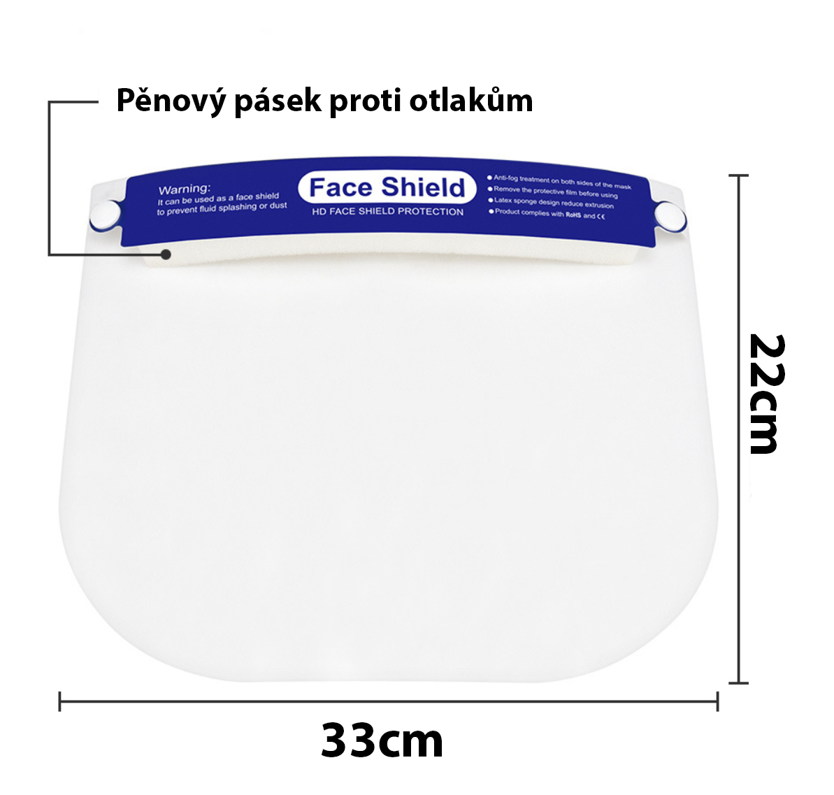 Przezroczysty, elastyczny wizjer jest wykonany z elastycznego PET i jest przymocowany do paska z piankową wyściółką w górnej części, co zapewnia komfort nawet podczas długotrwałego noszenia i chroni użytkownika przed pęcherzami. Maska jest mocowana wokół głowy za pomocą szerokiej gumowej tkaniny, którą można rozciągnąć w zakresie 29-50 cm, dzięki czemu jest uniwersalna i pasuje do każdej głowy (dzieci i dorosłych). Przyłbica jest elastyczna, a po założeniu zaokrągla się i dopasowuje do rozmiaru głowy, wymiary przyłbicy to: 33x22cm (szer. x wys.). Przyłbica bezpiecznie chroni całą twarz, oczy, nos i usta. Zaleca się stosowanie maski w połączeniu z fartuchem lub maską.