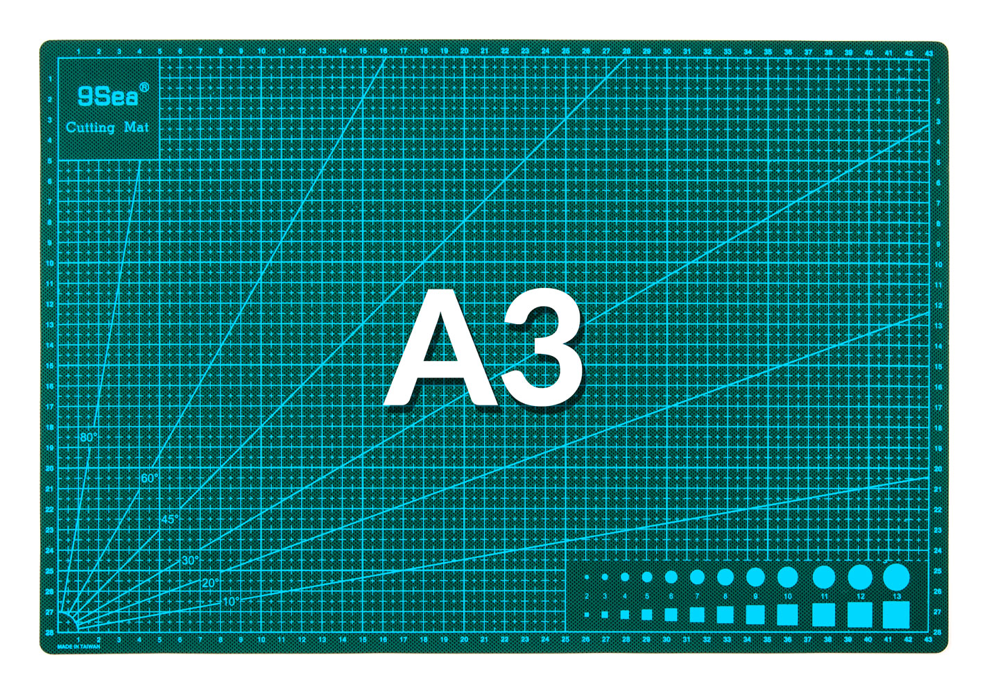 Podkładka jest zadrukowana po obu stronach. Na głównej stronie znajduje się siatka pomiarowa z oznaczeniem centymetrowym 42x28cm. Siatka pomiarowa ma również zaznaczone środki poszczególnych bloków centymetrowych, dzięki czemu można mierzyć z dokładnością do 0,5 cm. Na stronie głównej znajdują się również oznaczenia kątów (kątomierz) skalibrowane w 0,10,20,30,45,60,80 i 90° dla łatwego cięcia kątowego. W prawym dolnym rogu znajduje się również oznaczenie średnic okręgów, dla porównania od 2 do 13 mm i kwadratów o długości boku od 2 do 13 mm.