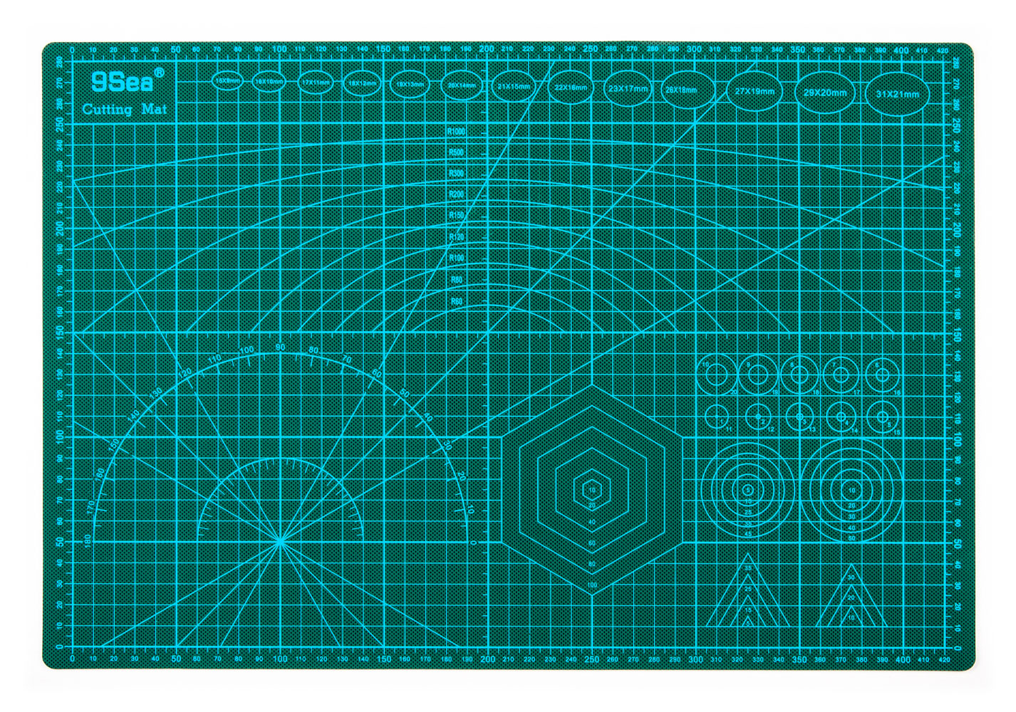 Druga strona podkładki oferuje również siatkę skalibrowaną w krokach co 10 mm - 420x280 mm, większy kątomierz skalibrowany w krokach co 5°, 0 - 180° i pomiary średnic od 1 mm do 1000 mm. Podkładka ma również zaznaczone owale od 15x9 do 31x21 mm i sześciokąty o długości boku od 10 do 100 mm (10,20,4,60,80,100). W prawym dolnym rogu znajdują się również trójkąty równoboczne o długościach boków 5,10,15,20,25,30 i 35 mm.
