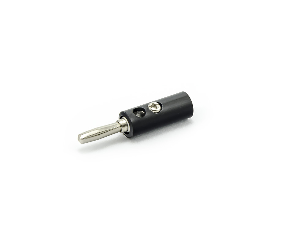 Złącze - 4 mm, czarne, ze stykiem sprężynowym, do przykręcenia przewodu. Wtyczka posiada gniazdo, do którego można podłączyć kolejny banan.