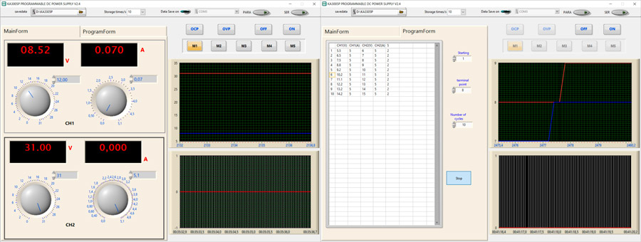 Druga zakładka (ProgramForm) umożliwia ustawienie profili zasilania w zależności od ustawionego czasu - idealne rozwiązanie do testowania i aplikacji, które wymagają różnych poziomów napięcia i prądu w wybranym okresie czasu. Liczba poziomów napięcia i prądu jest dowolna - można ich dodać więcej. W programie można również wybrać punkt początkowy i końcowy (interwał linii) oraz liczbę powtórzeń (cykli).