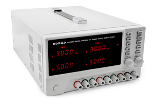 . Zasilacz Korad KA3305P oferuje ciągłą cyfrową regulację napięcia i prądu w dwóch gałęziach w zakresie od 0 do 30V i od 0 do 5A. Trzecia gałąź ma niezmienne 5V i 3A. Zasilacz umożliwia precyzyjną i bezstopniową regulację w krokach co 10 mV i 1 mA.
