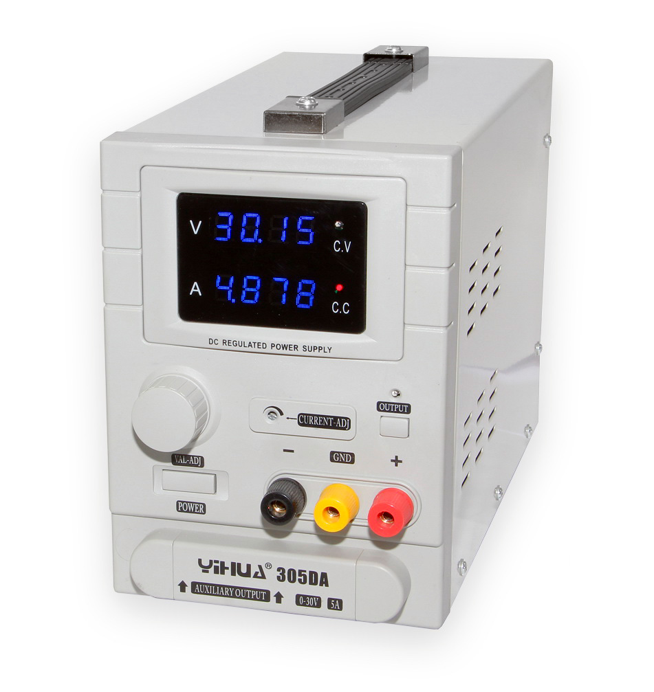 Liniowy precyzyjny zasilacz laboratoryjny z cyfrowymi wskaźnikami i przyciskiem przekaźnikowym do podłączania i odłączania zacisków wyjściowych. Cyfrowe wskaźniki napięcia i prądu mają podziały 10mV i 1mA. Zasilacz jest wyposażony w styki śrubowe do stałego podłączenia zasilanych części obwodu, oprócz konwencjonalnych zacisków wyjściowych dla bananów. Naciśnięcie przycisku OUTPUT odłącza wyjście zasilacza od zacisków i umożliwia zmianę napięcia bez wpływu na zasilany obwód. Tylko w celu rekonfiguracji parametrów zasilacza można ponownie podłączyć napięcie zasilania do obwodu, naciskając przycisk OUTPUT.