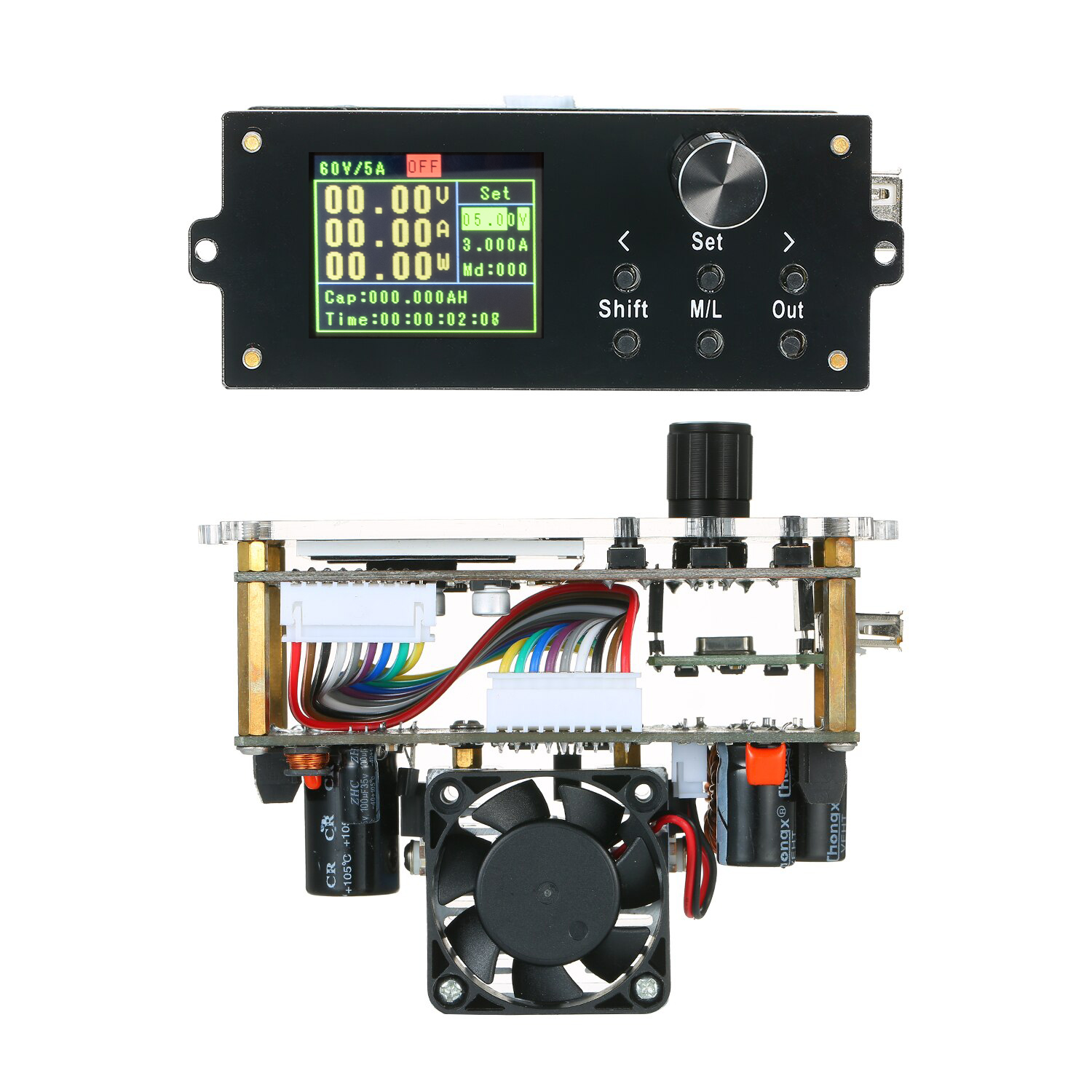 Główny przezroczysty panel z poliwęglanu z czarnym tłem zawiera 1,8-calowy kolorowy wyświetlacz LCD do wyraźnego wyświetlania napięcia, prądu i mocy oraz do szybkiej regulacji wszystkich niezbędnych parametrów. Moduł pozwala na płynną regulację prądu i napięcia w zakresie 0-60V / 0-5A z rozdzielczością do dwóch miejsc po przecinku. Dokładność odchylenia źródła wynosi tylko +-10mA / +-10mV. Modu posiada zabezpieczenia i tryby pracy znane z zasilaczy profi lab: Opv, Ocp, Opp. Dzięki wbudowanej pamięci można wybrać i zapisać do dziesięciu presetów V/A.