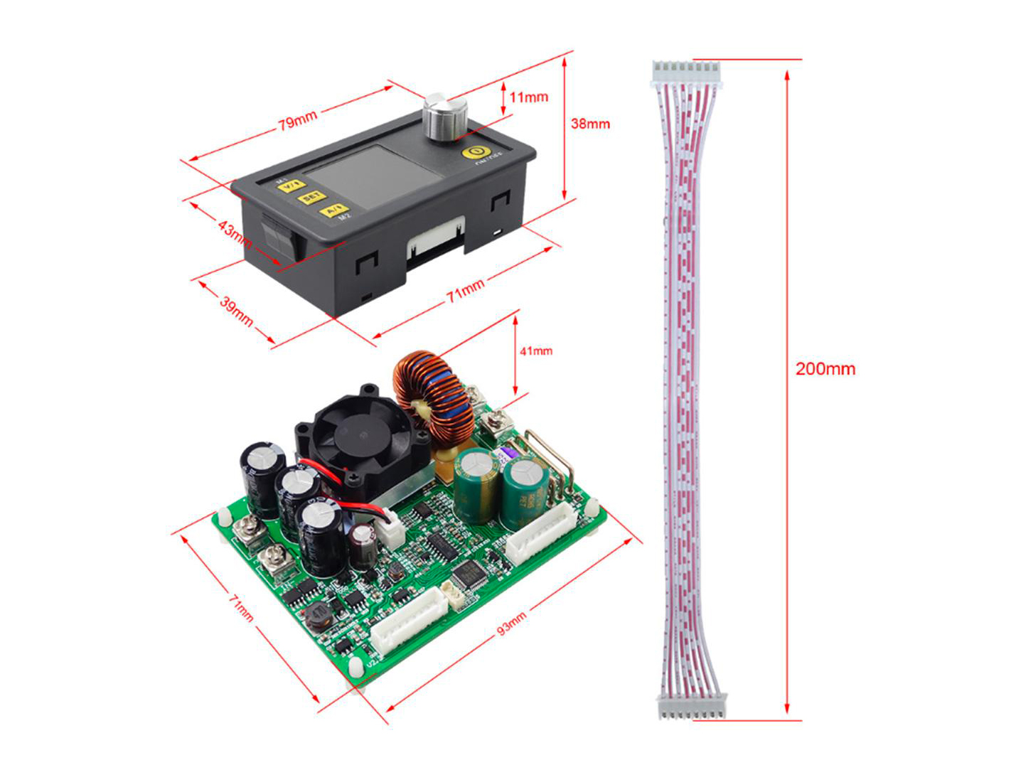 Cały moduł składa się z dwóch części: wyświetlacza z elementami sterującymi oraz części zasilającej z aktywnym chłodzeniem, obie części połączone są ze sobą wielożyłowym kablem o długości 20cm