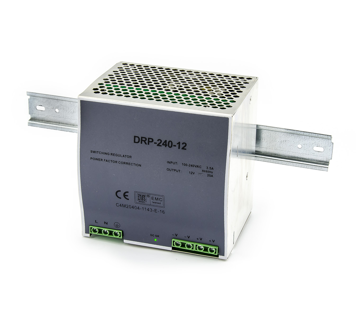 Zasilacz może być zasilany napięciem z zakresu: 100-240VAC (3,5A). 50/60Hz. DRP-240-12 oferuje dwie pary zacisków dla wyjścia 12V (1 kanał). Napięcie wyjściowe zasilacza można skalibrować za pomocą trymera obrotowego w zakresie +/-10% (ok. 11 - 14V). Wyłączenie zasilacza jest sygnalizowane za pomocą diody LED na panelu przednim (na zaciskach wyjściowych).