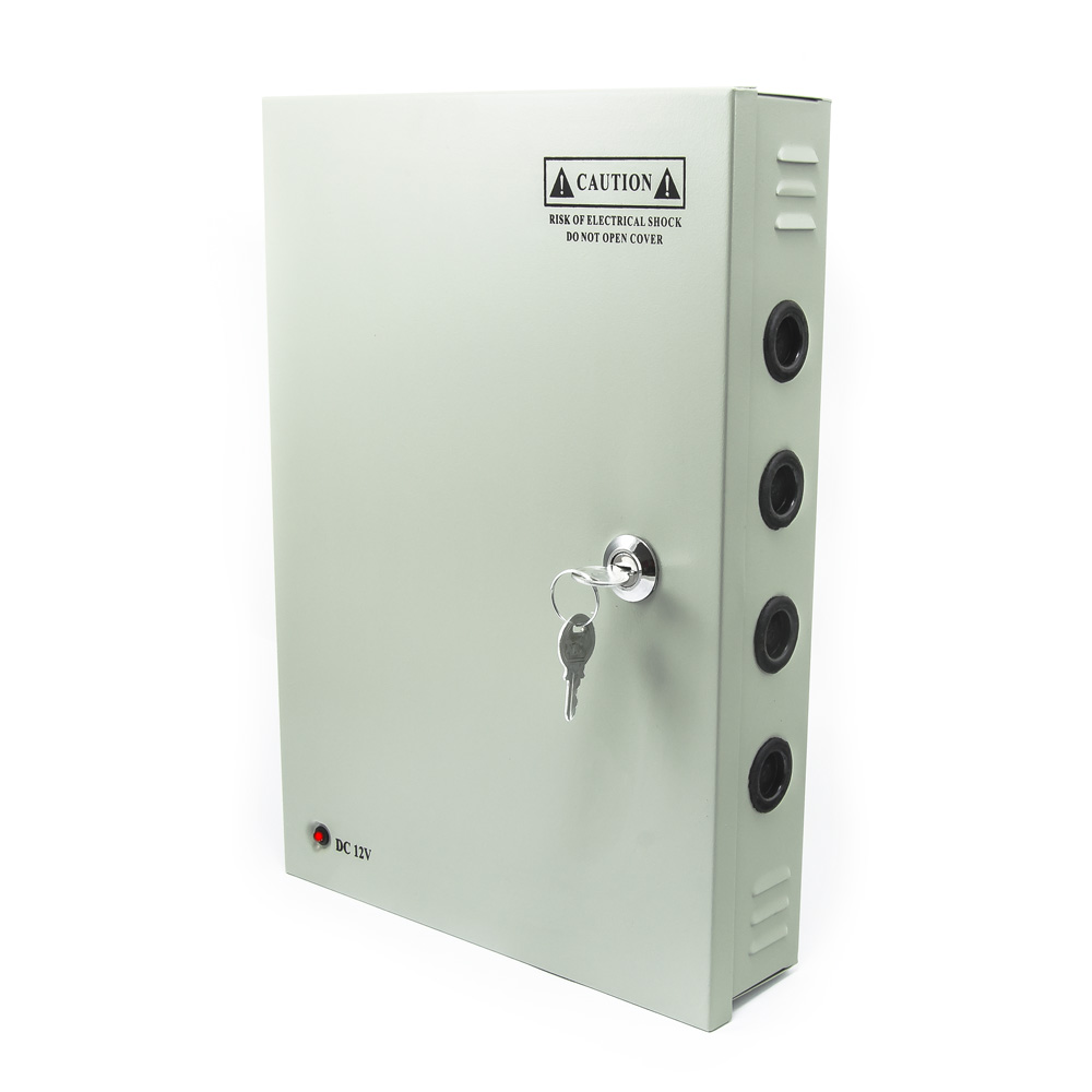 Uniwersalna metalowa szafa zasilająca - rozdzielnica dla maksymalnie 9 zabezpieczonych wyjść z zamkiem na klucz, odpowiednia do kamer CCTV, technologii bezpieczeństwa, oświetlenia LED i innych zastosowań, w których konieczne jest ukrycie modułowego zasilacza przemysłowego i jednoczesne zabezpieczenie wyjść.