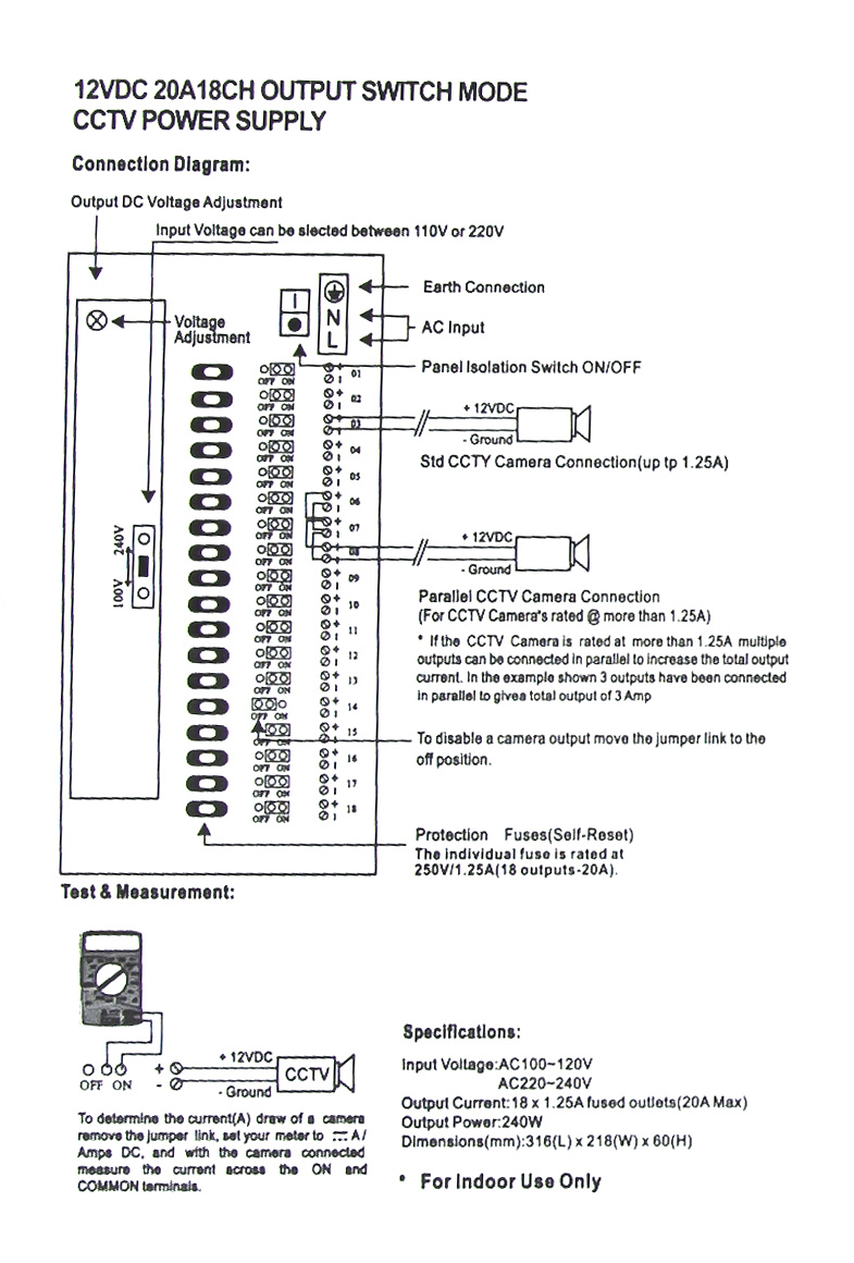 Rozdzielnica wyposażona jest w płytkę drukowaną z bezpiecznikami i zaciskami śrubowymi dla każdego kanału, co zapobiega zwarciu całego systemu, np. w przypadku przecięcia kabla jednej z kamer itp. Każdy kanał zawiera zieloną diodę LED wskazującą zasilanie dla danego kanału. Płytka drukowana zawiera również listwę zaciskową do doprowadzenia zasilania sieciowego, wyłącznik główny i kable do podłączenia wewnętrznego zasilacza 12 V, który można wybrać zgodnie z własnymi wymaganiami dotyczącymi zasilania (rozdzielnica jest dostarczana bez zasilacza). Do tej rozdzielnicy zalecamy wybór zasilacza modułowego 12 V 10 A, który jest bezpośrednio kompatybilny z tą rozdzielnicą i można go łatwo przymocować za pomocą śrub. Rozdzielnica ma czerwoną diodę LED stanu w drzwiach, wskazującą zasilanie 12 V. Oprócz kamer CCTV, rozdzielnica nadaje się również do technologii bezpieczeństwa lub diod LED, które również są zasilane napięciem 12V DC.