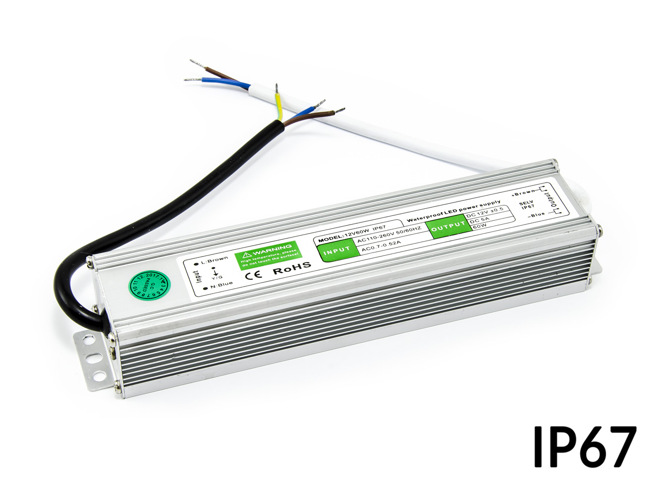 Wodoodporny zasilacz impulsowy 12V 5A dla maksymalnej mocy wejściowej 60W z klasą wodoszczelności IP67, przeznaczony głównie do zasilania taśm LED, do zabudowy, w szafach sterowniczych i do użytku na zewnątrz.